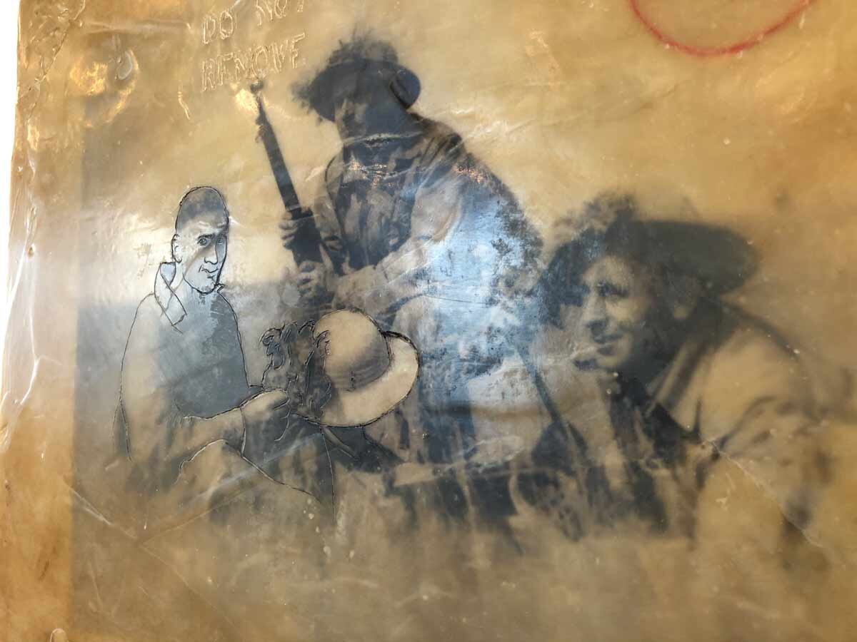 For me, reproducing these photos and then covering them in layers of wax is a way to demonstrate my desire to preserve the memories in these photos. I've carved into the wax layers, tracing over the forms, and then rubbing oil paint into the lines to outline and highlight the important subjects in the photos, and make sure they don't get lost under the layers. These photos were all clearly stamped by the archives with "DO NOT REMOVE" and "RESEARCH ONLY," and I've maintained these instructions in my paintings, echoing a sentiment that these not be removed (from our collective conscious), but instead used as for research or reflection.